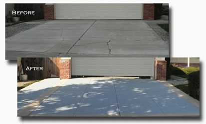 Our Solution: Cracks repaired with concrete epoxy injections. Additional control joints were cut into slabs to minimize future cracking. Whole driveway resurfaced with polymer modified cementitious topping, then coated with lifetime concrete grey pigmented stain and clear-sealed. Note decorative border in tan, made of the same material. The result is a durable,attractive, easily maintained, stain and oil resistant and non-skid surface, that should last a lifetime.