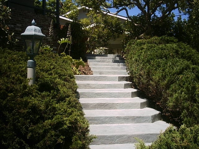 A natural stone finish, inspired by the verdigris lamp in this Oakland Hills home provides a dramatic look for the front steps. The textured finish also gives a non-slip surface, a big improvement over their previously painted steps.